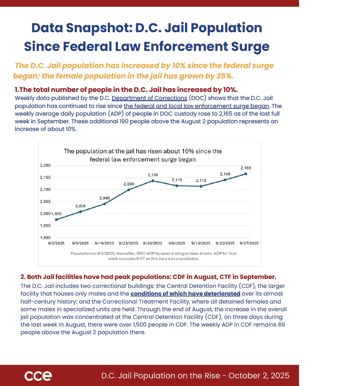 Today, CCE released a data snapshot showing the population of the D.C. Jail population rising since the August 2025 law enforcement surge.