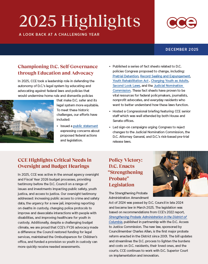 In the fall of 2025, CCE released a series of educational fact sheets focused on different aspects of D.C. criminal law, youth justice, courts, and legal systems that are receiving local and national attention.