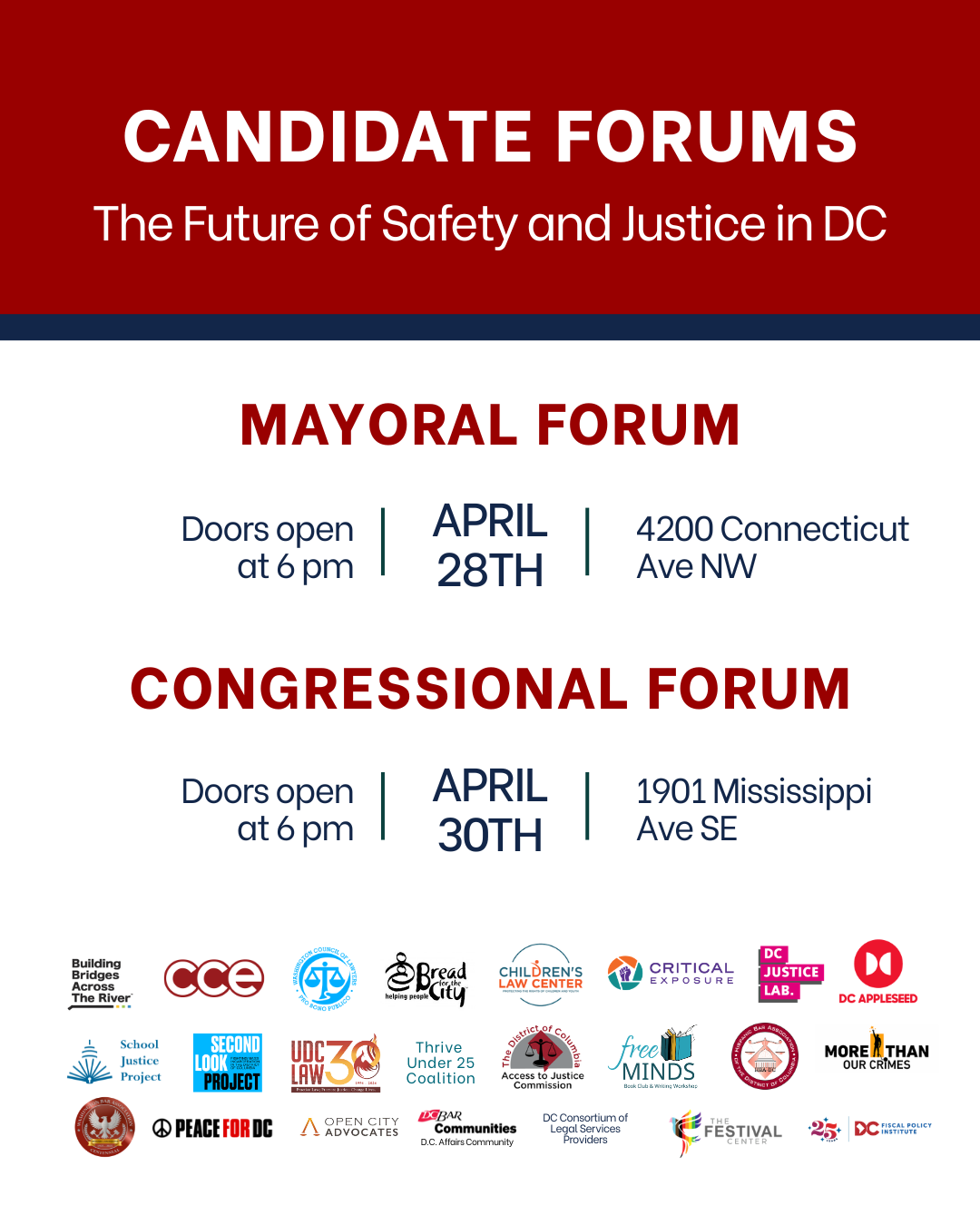 On April 28 and April 30 CCE and our partner organizations will be hosting Mayoral and Congressional Candidate Forums on The Future of Safety & Justice in D.C.
